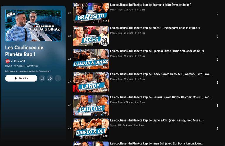Pendant mon expérience en tant que cadreur et monteur vidéo chez Skyrock, j’ai lancé avec l’équipe de Planète Rap un format inédit : Les Coulisses de Planète Rap.
